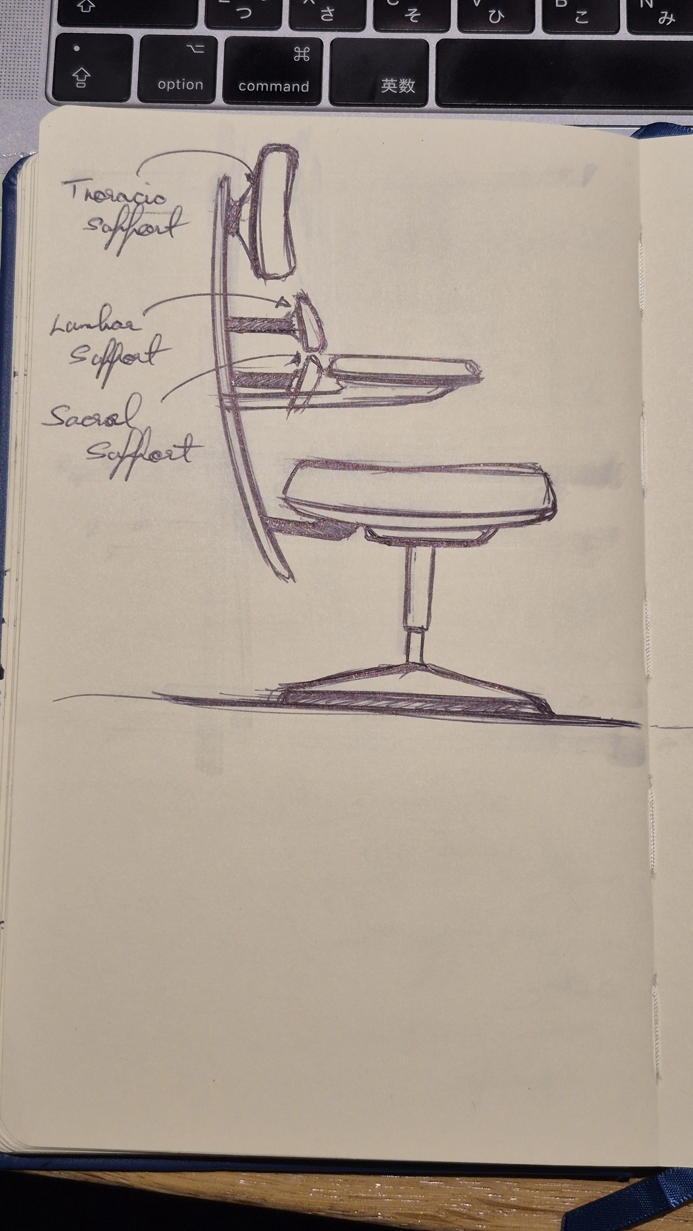 The design of the chair has 4 individually adjustable regions. The seat, the Thoracic, the lumbar and the sacral.